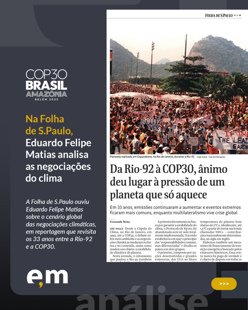 Entrevistado pelo jornal Folha de S.Paulo, o sócio Eduardo Felipe Matias, doutor em Direito Internacional pela USP e autor de A humanidade contra as cordas, analisou a evolução das negociações climáticas e os desafios geopolíticos que podem dificultar o cumprimento das metas da COP-30. Também destacou o papel do setor privado, especialmente o financeiro, no enfrentamento das mudanças climáticas.