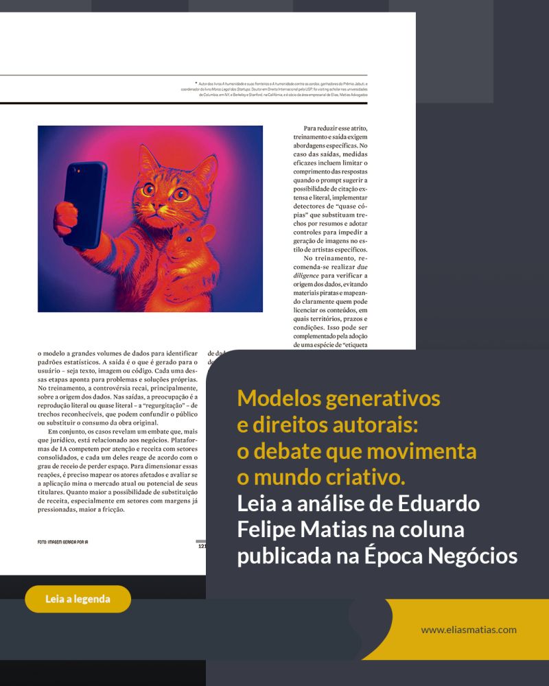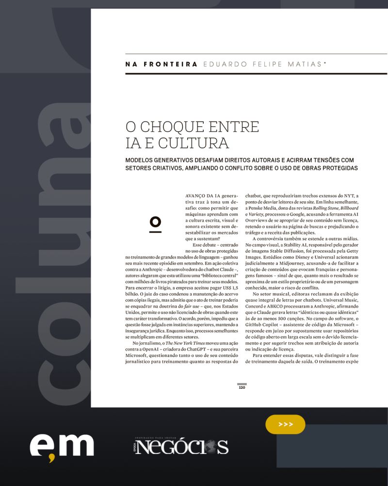 Na edição mais recente da revista Época NEGÓCIOS, Eduardo Felipe Matias abordou as tensões entre tecnologia e criação humana diante do avanço da inteligência artificial generativa. A coluna discute os impactos sobre autoria, originalidade e direitos autorais, e os desafios para equilibrar proteção jurídica e inovação.