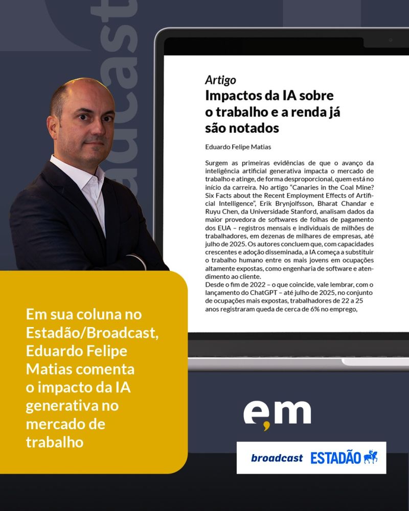 Em sua coluna no Estadão/Broadcast, Eduardo Felipe Matias comentou dois estudos que investigam os efeitos da inteligência artificial sobre o mercado de trabalho. O primeiro aponta que profissionais em início de carreira são os mais vulneráveis ao avanço da IA generativa. O segundo analisa como a possível chegada da AGI pode reduzir a participação do trabalho na economia.